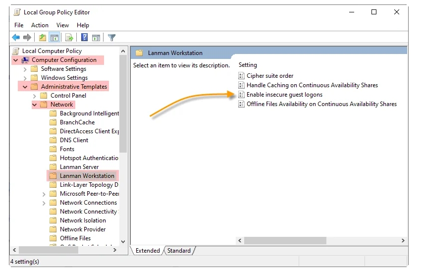 Local Computer Policy > Computer Configuration > Administrative Templates > Network > Lanman Workstation.