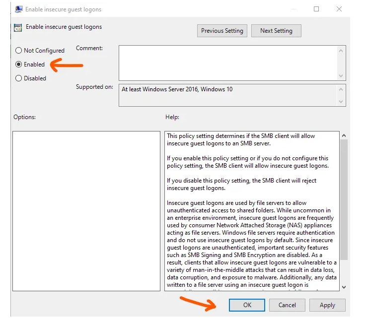 Double Click Enable insecure guest logons เพื่อทำการ Enable กด OK แล้วทำการรีสตาทเครื่อง