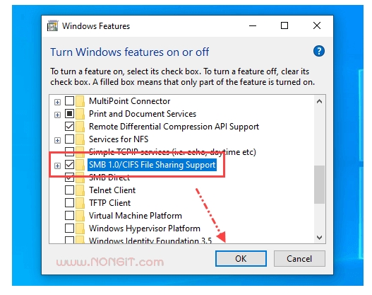 3. ที่หน้าต่าง Turn Windows features on or off (คุณลักษณะของ Windows) ให้ทำเครื่องหมายถูกที่ช่อง SMB 1.0/CIFS File Sharing Support (สนับสนุนการแบ่งปันแฟ้มแบบ SMB 1.0/CIFS) แล้วให้คลิกปุ่ม Ok (ตกลง)
