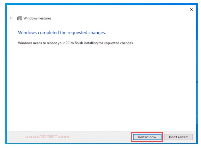 4. รอให้ระบบติดตั้งฟีเจอร์ให้เรียบร้อย เมื่อเสร็จแล้วจะแสดงหน้าต่างให้คลิกปุ่ม Restart now (เริ่มระบบใหม่เดี๋ยวนี้)